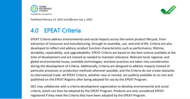 无论您是科技制造企业,还是品牌持有者,只需满足对应产品类别的Epeat标准,即可申请认证。GEC提供清晰的政策指南与年度更新支持,助您轻松迈入绿色赛道。